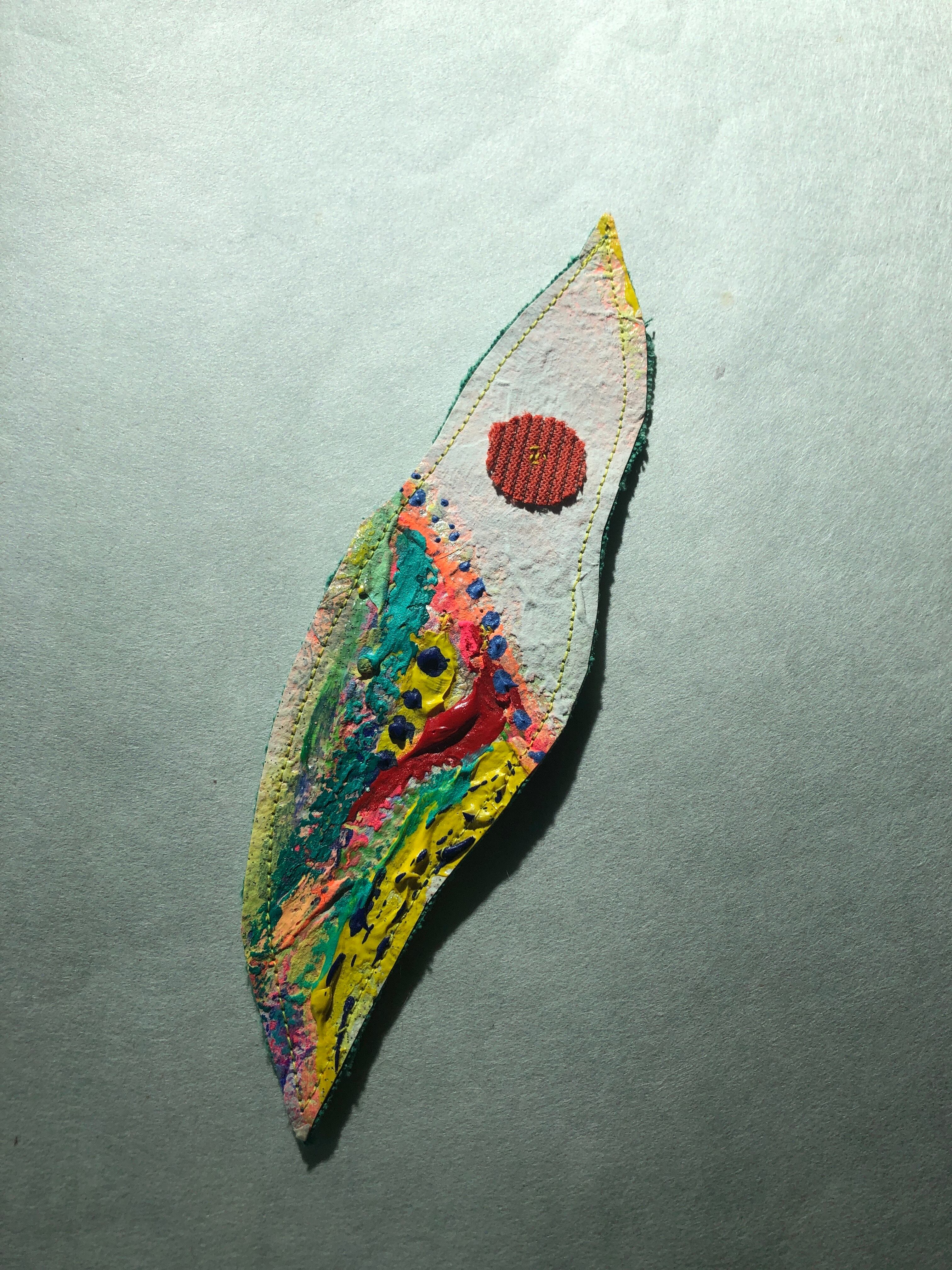 オーストラリアに生息するレインボーロリケートという5色インコからインスピレーションを受け制作した衣装のあまり布と、和紙にアクリル絵の具で描いたレインボーロリケートを切り取り、制作したKanartオリジナルアートアクセサリー